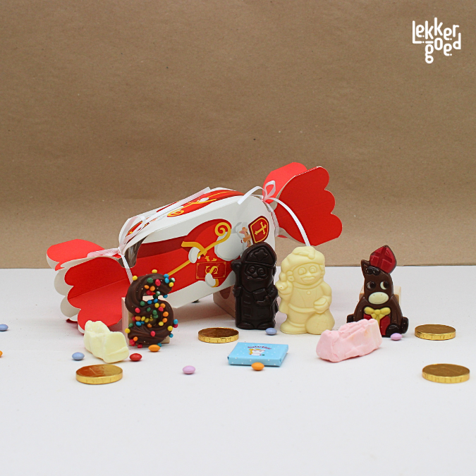 Speels doosje met enkele karaks, minifiguurtjes en Sintsnoep.