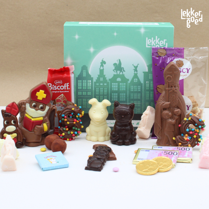 Een verzorgd, fijn Sintpakket, kant en klaar: leuke, diverse producten. 1 voor 1 superlekker!