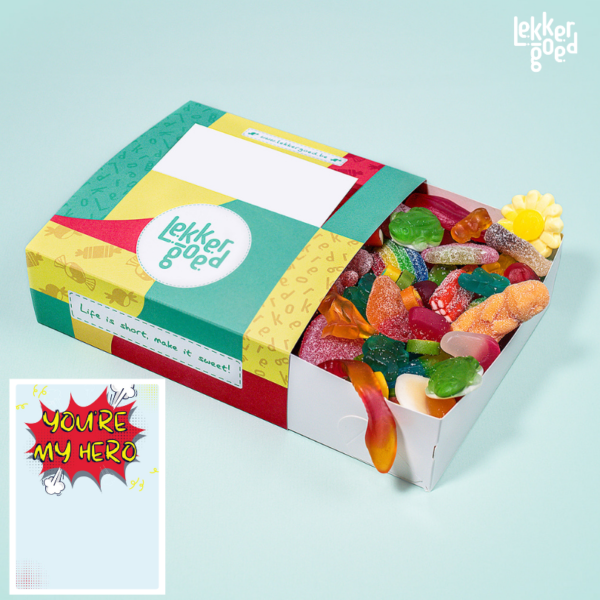 - Op een kaartje dat in de sleeve schuift, komt uw persoonlijke boodschap. U koos voor de variant ‘You’re my hero’. Uw persoonlijke boodschap komt daar onder en is zichtbaar als het kaartje uit de sleeve geschoven wordt.
